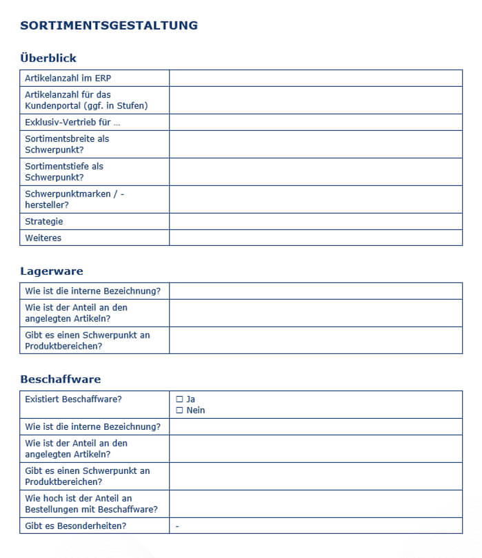 Dieser Schlüsselbereich umfasst Detailfragen zur Sortimentsgestaltung und Freiräume für Ihre Antworten auf über 10 Seiten.