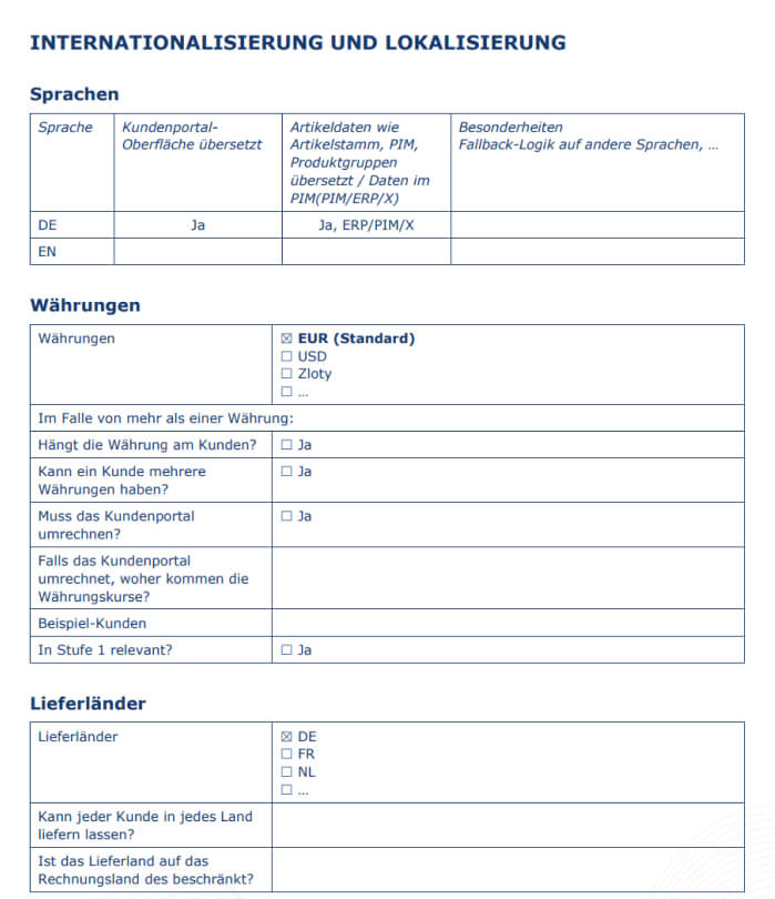 Im Fragesegment der Internationalisierung finden Sie alle Detailfragen, die für die Internationalisierung und Lokalisierung Ihrer E-Commerce Lösung relevant sind.