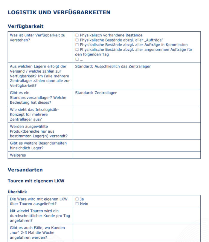Im Lastenheft-Schlüsselsegmement zur Logistik und zu den Verfügbarkeiten finden Sie auf 8 Seiten Detailfragen zu allen wichtigen Aspekten Ihres neuen B2B-Shops bzw. Ihres neuen Kundenportals.