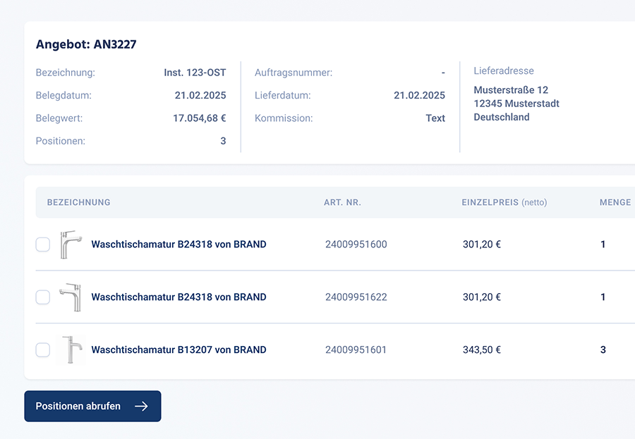 Kunden können direkt im Portal Angebote anfragen. Diese werden automatisch als Entwürfe im ERP angelegt und dann vom Innendienst bearbeitet. Das zurückgespielte Angebot kann vom Kunden einfach in den Warenkorb gelegt werden.